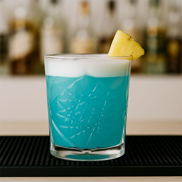 Vodka – Lys rom – Kokossirup – Blue Curacao – Mælk – Ananasjuice